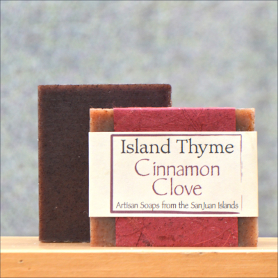 Saponified oils of olive, coconut, palm (sustainably harvested), castor, powdered cinnamon bark, essential oils of cinnamon and clove.